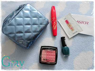 Astor - świetna kosmetyczka :D, nowa wersja tuszu Play it Big, morski (a raczej choinkowy) lakier, śliczny róż, próbka nowego podkładu.