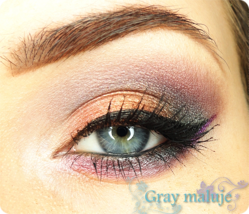 Okej, tego nie było. Za to jest makijaż! Połączenie miedzianych odcieni z ciemną, szmaragdową zielenią roztarte wrzosowymi fioletami. Do tego zalotna czarna kreska "podbita" lekko fioletową. Całość zgrana z dość ciemną, różową szminką - jak kto woli, można postawić oczywiście na usta nude. Makijaż stosunkowo "świetlisty", mocny i kolorowy. Cóż, czasem trzeba poszaleć ;)